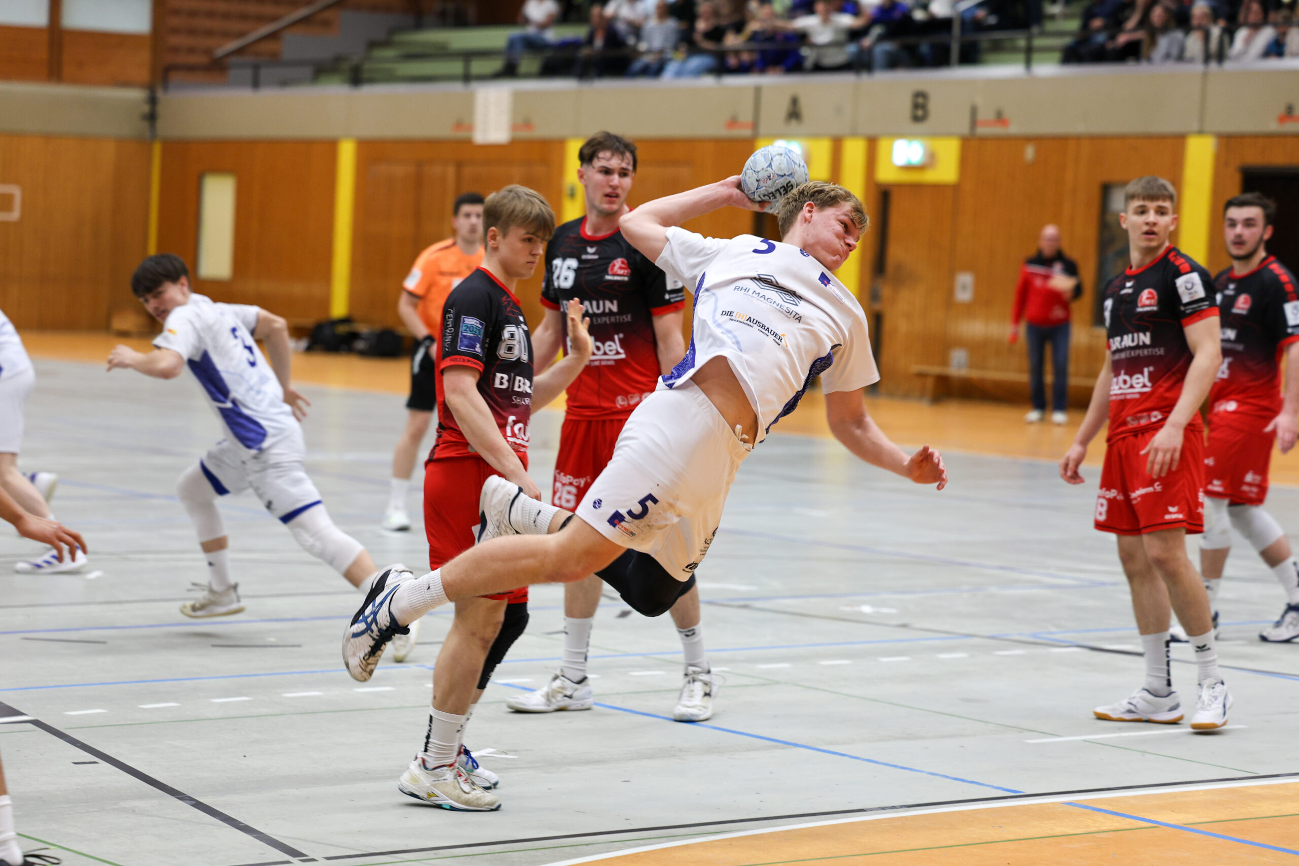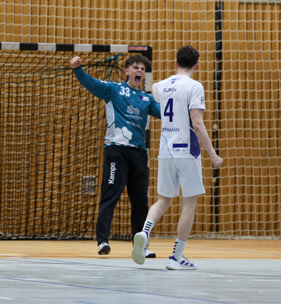 Nach einer gut organisierten, wenn auch zähen Anreise war vor dem Spiel klar zu spüren, wie beide Mannschaften auf dieses Viertelfinale hin gefiebert haben. Entsprechend war der Start der Partie vor einer großartigen, aber ausgeglichenen Kulisse, auch etwas nervös und erst in der dritten Minute durften die Bonner das erste Tor der Partie durch Levi Kaestner bejubeln. Danach entwickelte sich ein offener Schlagabtausch, bei dem aber schon klar wurde, dass die Bonner mit der Wurfgewalt von Tom Wolf im gebunden Spiel Probleme bekommen würden. Bis zum 5:5 durch den sehr fokussiert spielenden Niklas Bitzer konnte die Bonner JSG die Defizite in der Abwehr noch mit einem soliden Angriff egalisieren. Mit der ersten Zeitstrafe der Partie gegen Levi Kaestner verloren die Bonner erstmalig den Anschluss. Immer wieder lief der extrem agile Lasse Ohl seinen Bewachern clever davon und wurde durch Wolf und Co. in Szene gesetzt. Der größte Abstand sollte beim 17:11 und 18:12 um die 20. Spielminute erreicht werden.