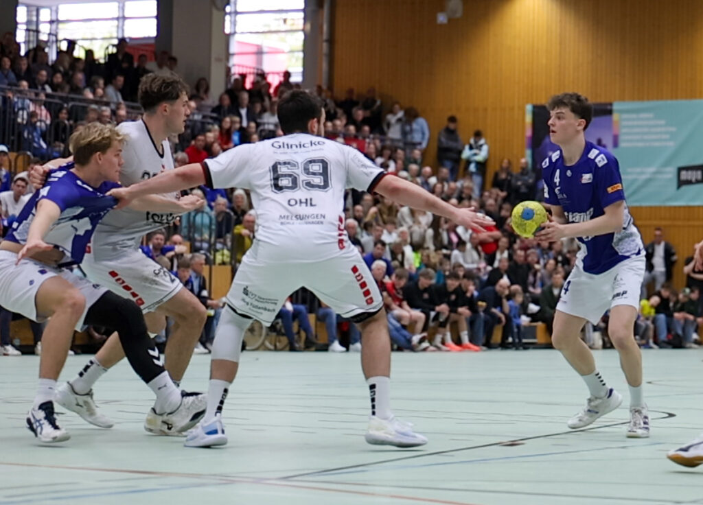Diese entscheidende Phase der Partie wurde auch vom Publikum erkannt und es wurde zum unverkennbaren Faktor. Alle in der Halle waren spätestens jetzt vollkommen angezündet von der packenden Partie. Wie eine Welle, die auf das Spielfeld schwappt wurde die Emotion von der Tribüne von den Jungs aufgesogen und nochmal eine Schippe Leidenschaft draufgelegt. Eine Parade von Czerwinski sowie ein überragender Steal von Bent Bieler und das Spiel war wieder gedreht. In dieser Phase schaffe es die Bonner JSG gut auch alle Waffen im Kader in die Waagschale zu werfen. Kaylan Weber, Simon Jansen und Lennart Rohde machten dem Melsunger Angriff das Leben extrem schwer. Zudem konnte vorne Rückkehrer Tom Sander sein bärenstarkes 1:1 immer wieder einsetzen und forderte der MT Defense die letzten Körner ab. Dennoch gaben sich die MT Talents natürlich jetzt nicht auf und bis zum 20:21 in der 50. Minute schien alles offen.