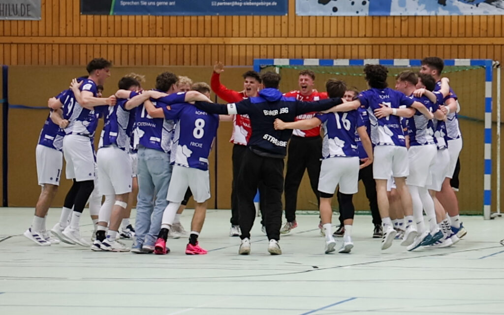 In der Crunchtime sollte dann die Stunde von Finn „Hoffi“ Hoffmann schlagen. Der Bonner Spielmacher war eigentlich schon im roten Bereich nachdem er fast die komplette Spielzeit hinten und vorne aufopferungsvoll gekämpft hat. Doch wie von der Halle getragen sollte er einmal mehr der entscheidende Mann der Schlussphase werden. So gingen zunächst der Ausgleich und die erneute Bonner Führung auf sein Konto, ehe Levi Kaestner mit einem Gewaltwurf die Halle völlig zum überkochen bringen wollte und auf 2-Tore plus stellte. Der Anschluss-Treffer von Wolf wurde mit einem Kraftakt von Lennart Rohde beantwortet und spätestens jetzt war auch klar, dass der Bonner JSG wohl ein Unentschieden reichen würde, da die 30 Tore aus dem Hinspiel nicht übertroffen werden würden. Als dann die MT in der 59. Minute doch noch einmal über Wolf zum 24:24 Ausgleich kommen konnte war die Spannung auf dem Höhepunkt. Der vorentscheidende Bonner Angriff sollte kein einfacher werden. Wer sollte die Verantwortung übernehmen. Nach einigen versandeten Versuchen die Lücke in der MT Deckung zu finden, fasste sich Freddy Nüssen über Rückraum-Rechts ein Herz und nagelte aus schwierigem Winkel den Ball durch die Beine von Marius Knop ins Melsunger Gehäuse. Das Siebengebirgler Eigengewächs belohnte sich verdient für eine gute Partie und wurde von seinen heimischen Fans frenetisch gefeiert. Dass der letzte MT Angriff dann mit einem gescheiterten Anspiel an Ohl endete und Kevin Fricke im Gegenstoß den letzten Treffer vom überragenden Hoffmann vorbereitete ging fast schon in der eskalierenden Handball-Party am Sonnenhügel unter. Freude – Tränen – Emotionen bei allen Beteiligten. Der Einzug ins Final Four war mit dem 26:24 Sieg besiegelt.