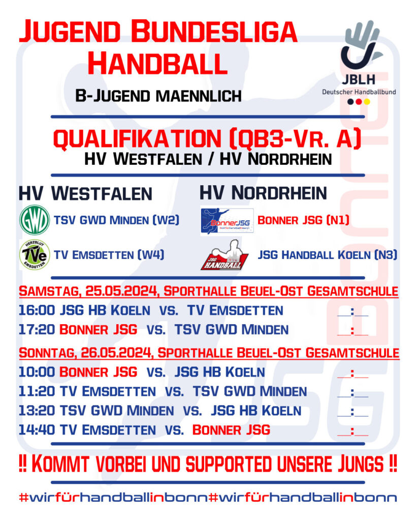 B-Jugend (24/25)NewsSaison 24/25 mB1 – Qualifikationsturnier JBLH (25./26.05.2024) by berndbinnenbruck 20. Mai 2024 written by berndbinnenbruck 20. Mai 2024 68 0 comments 0 FacebookTwitterPinterestThreadsBlueskyEmail berndbinnenbruck previous post Jugendbundesliga – DHB Pokal – Final Four Turnier next post Aufstieg in die B-Jugendbundesliga: Bonner JSG erfolgreich qualifiziert! Related Articles Bonner JSG mC2 unterliegt nach großem Fight und... 2. Dezember 2025 Bundesligahandball in Bonn – Die mB1 Jugend der... 2. Dezember 2025 Bonner JSG mC2 erkämpft 20:24 Auswärtssieg beim TuS... 25. November 2025 Bonner JSG mA1 – JSG Köln A1 –... 25. November 2025 Bonner JSG mB 2 – HBD Löwen Oberberg... 25. November 2025 Bonner JSG C2 – Brühler TV 35:31 (13:14) 17. November 2025 Bonner JSG mB2 – feiert Auswärtssieg in Ratingen… 17. November 2025 Bonner JSG mA1 festigt Platz 2 in der... 17. November 2025 Bundesligahandball in Bonn – Die mB1 Jugend der... 17. November 2025 Bonner JSG mC1 unterliegt der JSG Handball Köln 17. November 2025