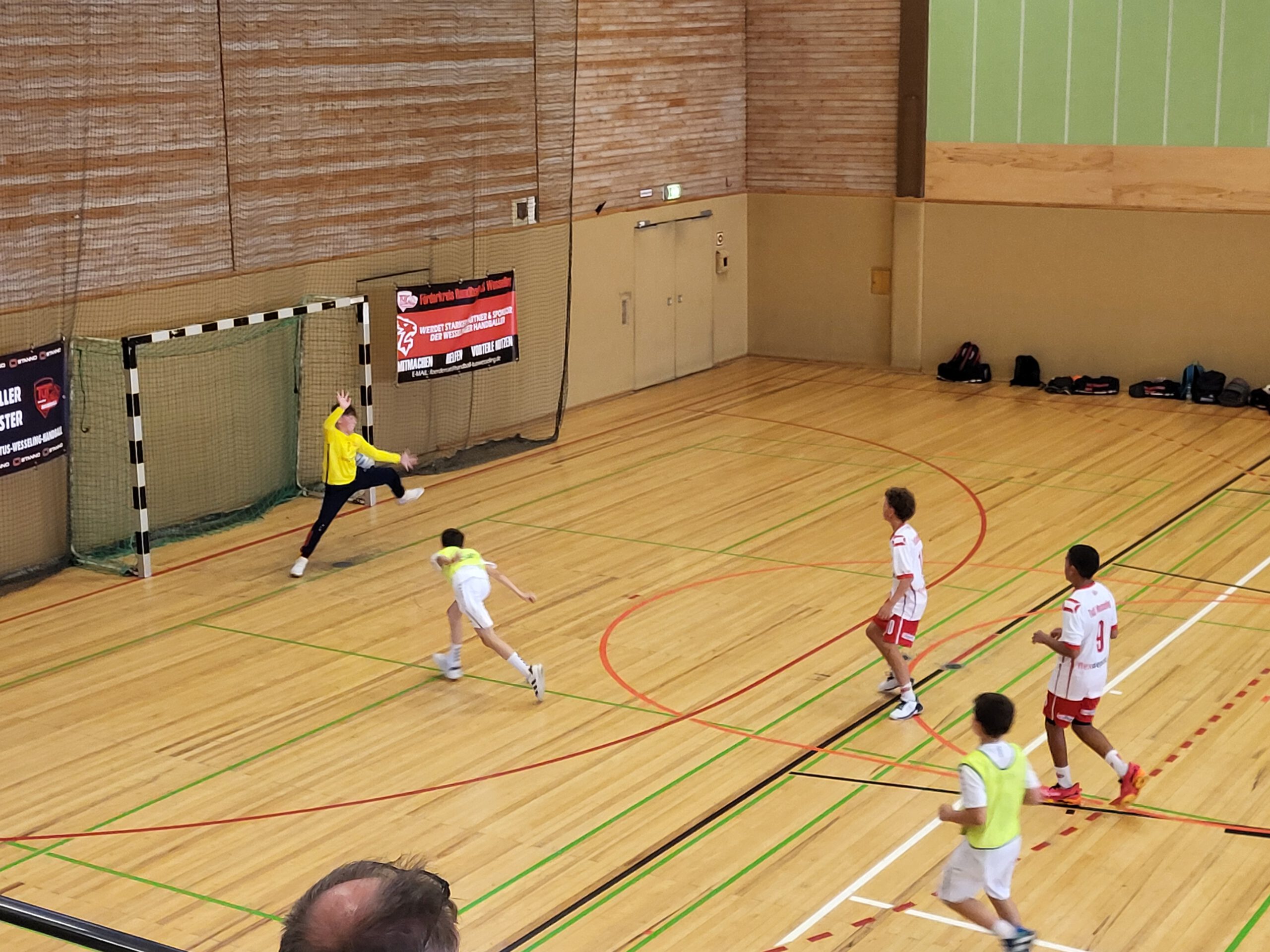 Förderkadertrainer Jogi legte den Fokus voll auf die Abwehr. Gegen den körperlich auf jeder Position überlegenen TuS wollte man mit einer offensiven Abwehr jede Menge Druck auf den Gastgeber ausüben. Dies gelang auch von Minute eins an. Nachdem sich Spielmacher Ole früh leicht verletzte, fehlte es im Angriff zunächst etwas an Geradlinigkeit. Ab Minute 7 beim Stand von 4:4 legten die Bonner den Hebel aber um. Es folgte ein 1:9 Lauf aus Sicht der Hausherren. Die JSG-Abwehr wachsam, das Umschaltspiel gut und auch im gebundenen Halbfeldhandball löste man die Dinge stets im Team. Schön rausgespielte Tore waren die Folge.