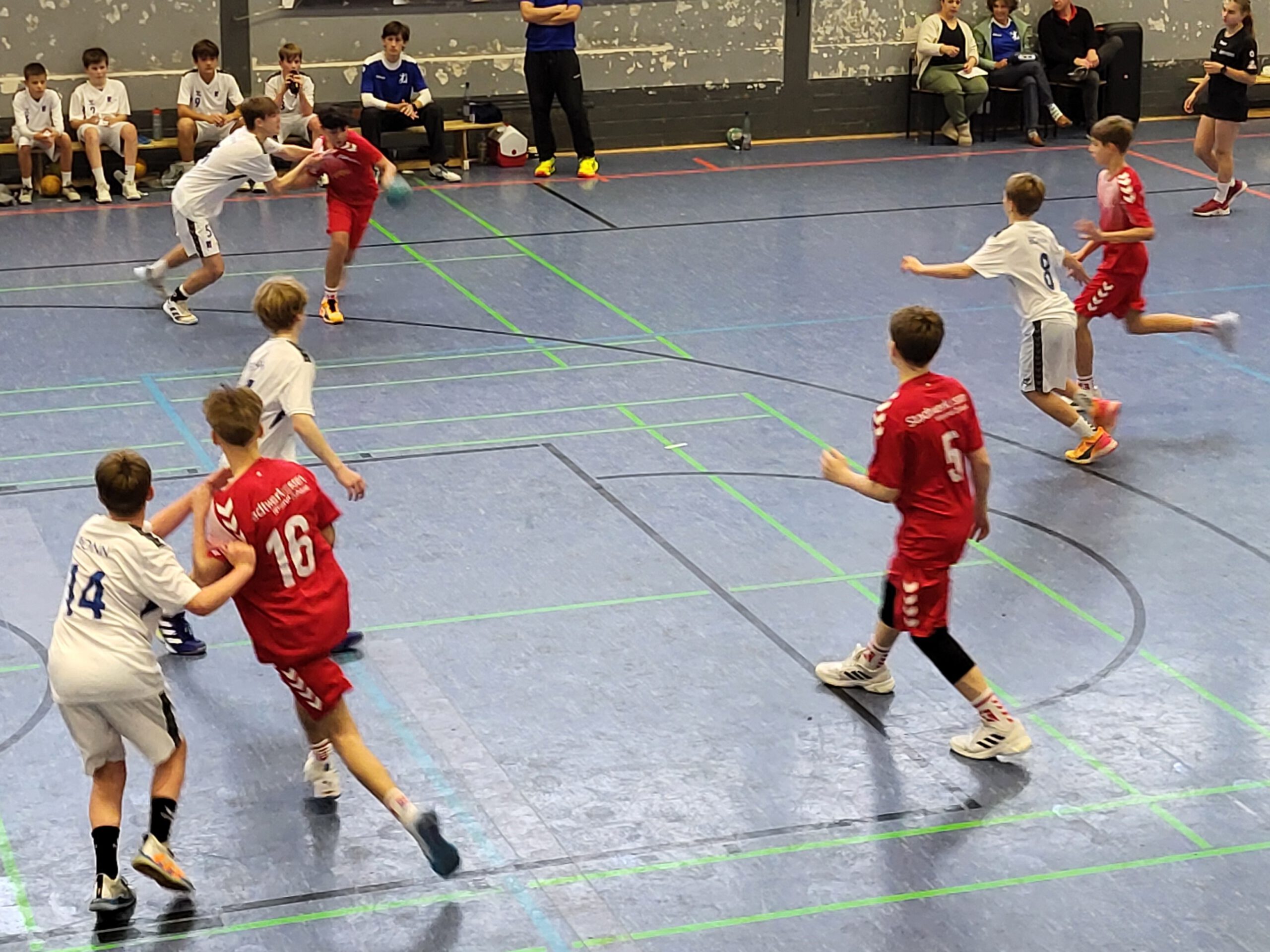 Für das junge Bonner Team, nach den sicher kraftraubenden Einheiten, eine große physische Herausforderung – hatten sich die Trainer doch auf einen speziellen 3×25 Minuten Modus geeinigt.  So war das Spiel auf Augenhöhe dann auch sicher nicht in allen Belangen ein Leckerbissen.  Ohne hier jetzt genauer auf das Spiel eingehen zu wollen, wurde das 1. Drittel bei 7:5 aus Bonner Sicht abgepfiffen. Das Mitteldrittel endete bei einem ausgeglichenen 19:19 und nicht wenige der zahlreichen Zuschauer waren sich sicher, dass die Bonner Jungs – nun doch sichtbar am Ende ihrer Kräfte – das Spiel möglichweise noch verlieren könnten.  Doch Kevin und Luk fanden in der zweiten Drittelpause noch ein paar Körnchen bei ihren Jungs und so konnte man den TuSEM Nachwuchsspielern doch weiter Paroli bieten und schlussendlich verdient mit 34:30 gewinnen.