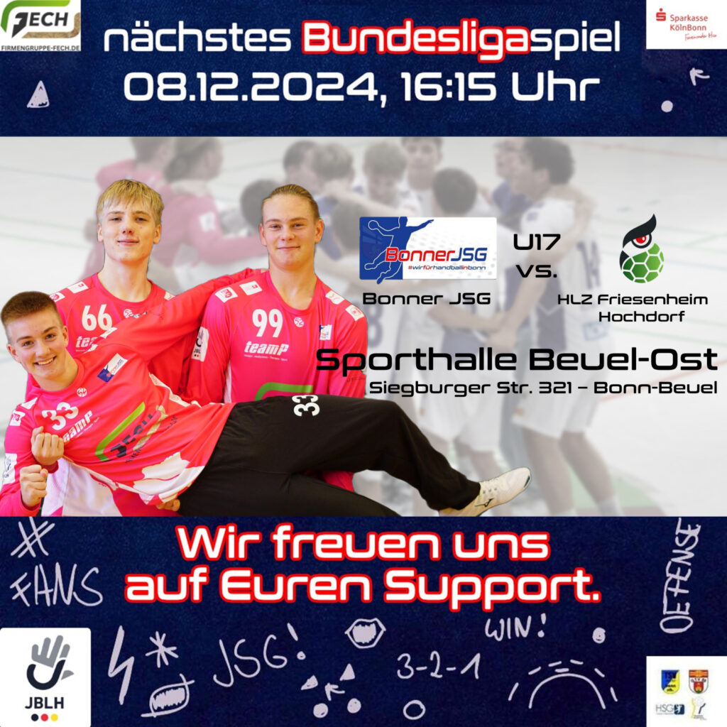 Direkt im Anschluss trifft die B1-Jugend als Tabellenführer der Jugendbundesliga Vorrunde 6 auf das HLZ Friesenheim-Hochdorf. Das Team von Tobias Swawoll und Julius Palmen wird alles daran setzen, den nächsten Heimsieg einzufahren und die Tabellenführung weiter auszubauen. Das Hinspiel konnten die Bonner Jungs knapp mit 27:29 für sich entscheiden – nun gilt es, diesen Erfolg vor heimischem Publikum zu wiederholen. Ein spannendes Spiel ist also garantiert!